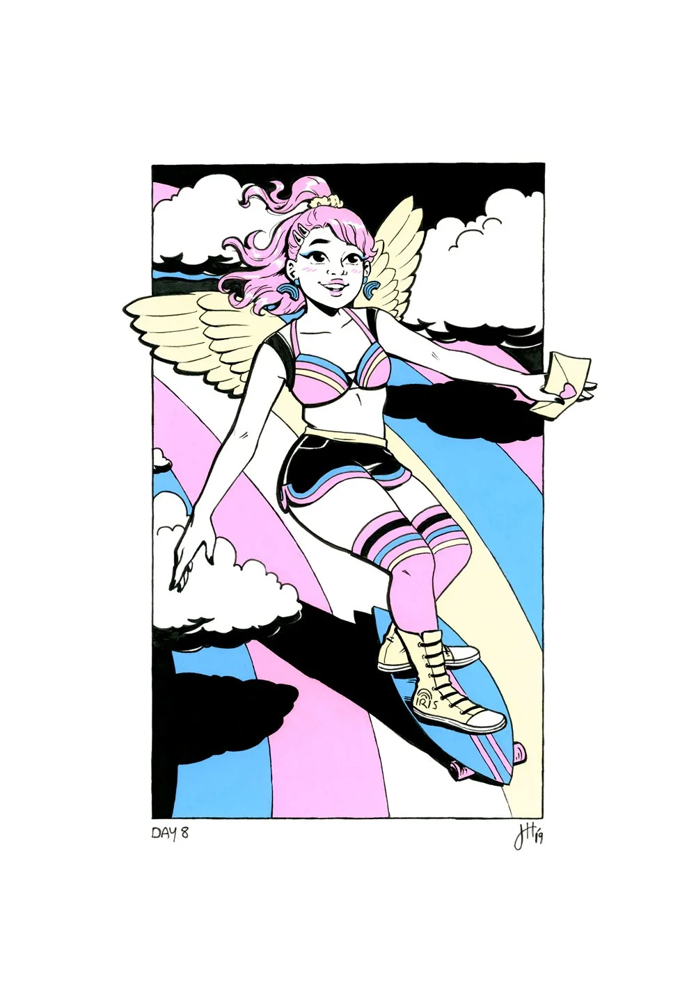 Based on the Greek Goddess Feast prompt list by Marcia Leben, this series started in 2019 and was completed in early 2023. The 31 chosen goddesses and dieties were interpreted in modern settings and clothes with each piece limited to 3 colours, plus black and white. Setting limitations like this can be helpful in creating a cohesive series of work, it also simplifies the composition and design choices, making it easier to create striking and clearly readable illustrations.